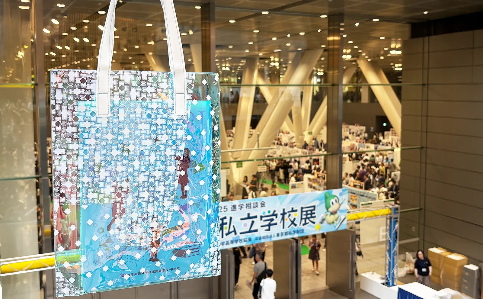 オープンキャンパスや学校イベント向けに製作した、オリジナルノベルティのトートバッグの事例をご紹介! 「女子美術大学付属高等学校・中学校様」に、東京都私立学校展での配布のためご製作いただいたオリジナルバッグ、ホログラムPVC+透明塩ビのマチなしトートバッグをご紹介します。今回は、デザインを手がけられた広報部主任・美術科ご担当の並木先生にもインタビュー! 小学校から高校、大学まで、幅広い学校のアピールに役立つバッグやグッズ製作をご検討のみなさま、ぜひご覧ください。 国際フォーラムでの大規模イベント 東京都私立学校展は、毎年数万人が来場する非常に大規模なイベントです。 2025年は東京都内413校が