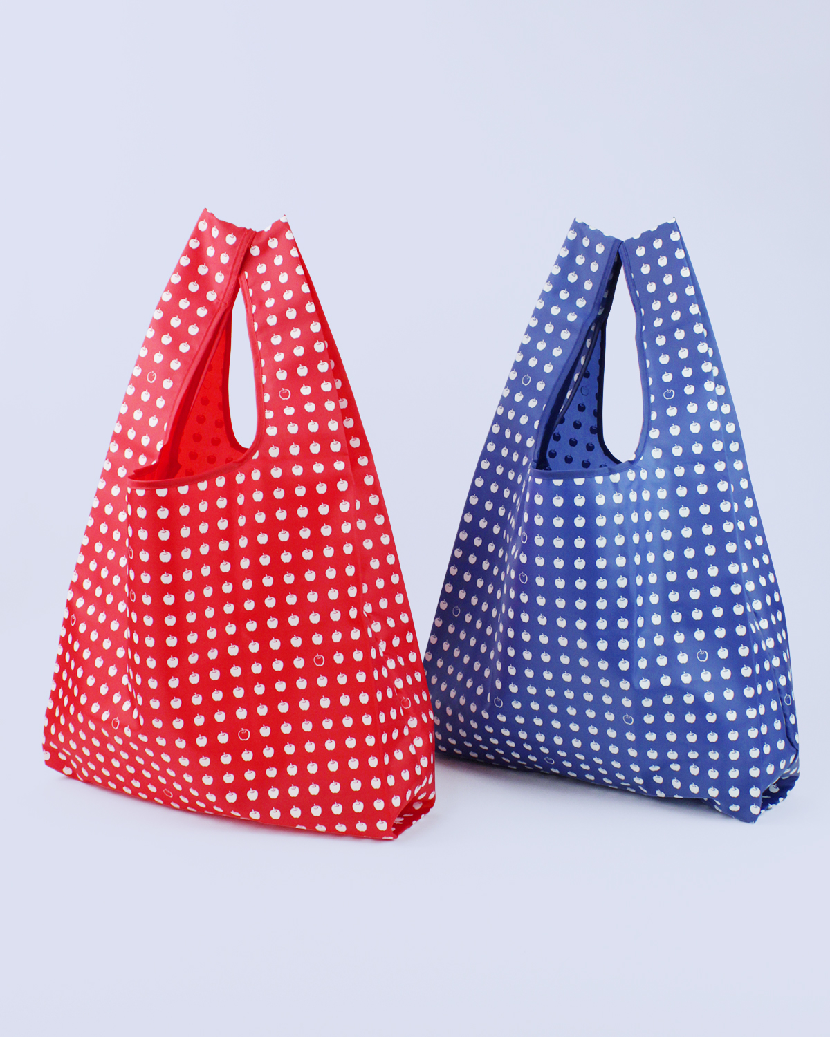 素材は、軽やかで柔らかな手触りのナイロン生地。レジ袋型のデザインは、中身をしっかり収納できるマチ付き仕様で、ちょっとした買い物やランチバッグとしても便利。付属のゴムストラップでコンパクトに折りたためば、日頃からカバンに入れておくことができ、日頃のお買い物にも活躍します。