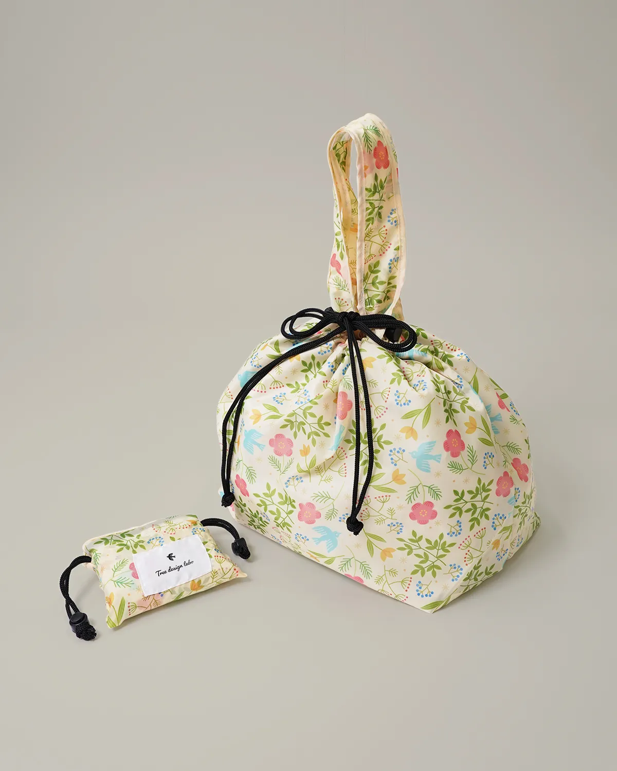 メイン素材には、光の角度によって表情を変えるホログラムPVCを使用し、下部にはナチュラルなコットン素材を切り替えて配置。内側にはウレタンとアルミ蒸着素材を採用し、保冷・保温性能を備えています。